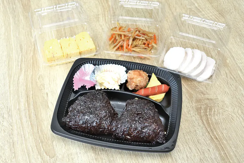 ご飯を包む岩のりは、香りが引き立つようにしょう油をまぶしてあり、一口目から最後まで風味豊かで食べ応えがあるのも嬉しいポイント。市内のすし店で作り方を教わったという卵焼き、2カ月以上かけて味を完成させた鶏肉の旨みが濃厚な塩味唐揚げ、とびきりやわらかな特製サラダチキンなど、総菜や弁当は冷めてもおいしく飽きがこないと評判で、毎朝通う常連客がいるのもうなずける逸品揃いだ。