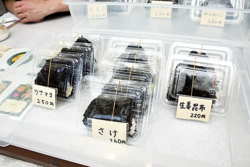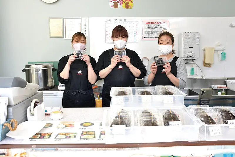 2022年にオープンしたおむすびと総菜弁当の持ち帰り専門店。以前介護職員として働いていた大石直美店主は、薄味でも満足感ある食事を作るため試行錯誤した経験から、塩分控えめで体に優しい味付けにこだわりメニューを考案。道北の稚内市から仕入れる鮭を甘塩で焼く「さけ」、子供にも人気の「おかか」「生姜昆布」など、10種類から具材を選べる「岩のりおむすび」は、毎朝5升炊きのガス窯でふっくらと炊きあげる道産米を優しくふんわりと握る。