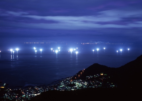 現在、大半を占めるのは9.9トンの中型船(船長約14メートル)で約40個の電球が備えられ、その明るさは120キロワット以内と、船体規模によって光力制限されています。とはいえ、月夜の下、海上に浮かぶ漁火は幻想的。函館の前浜がいか釣り船で埋め尽くされる頃には、本格的な夏の到来を市民に告げるだけでなく、函館山展望台を訪れたり、海に面した露天風呂を利用する観光客の目を楽しませてくれます。