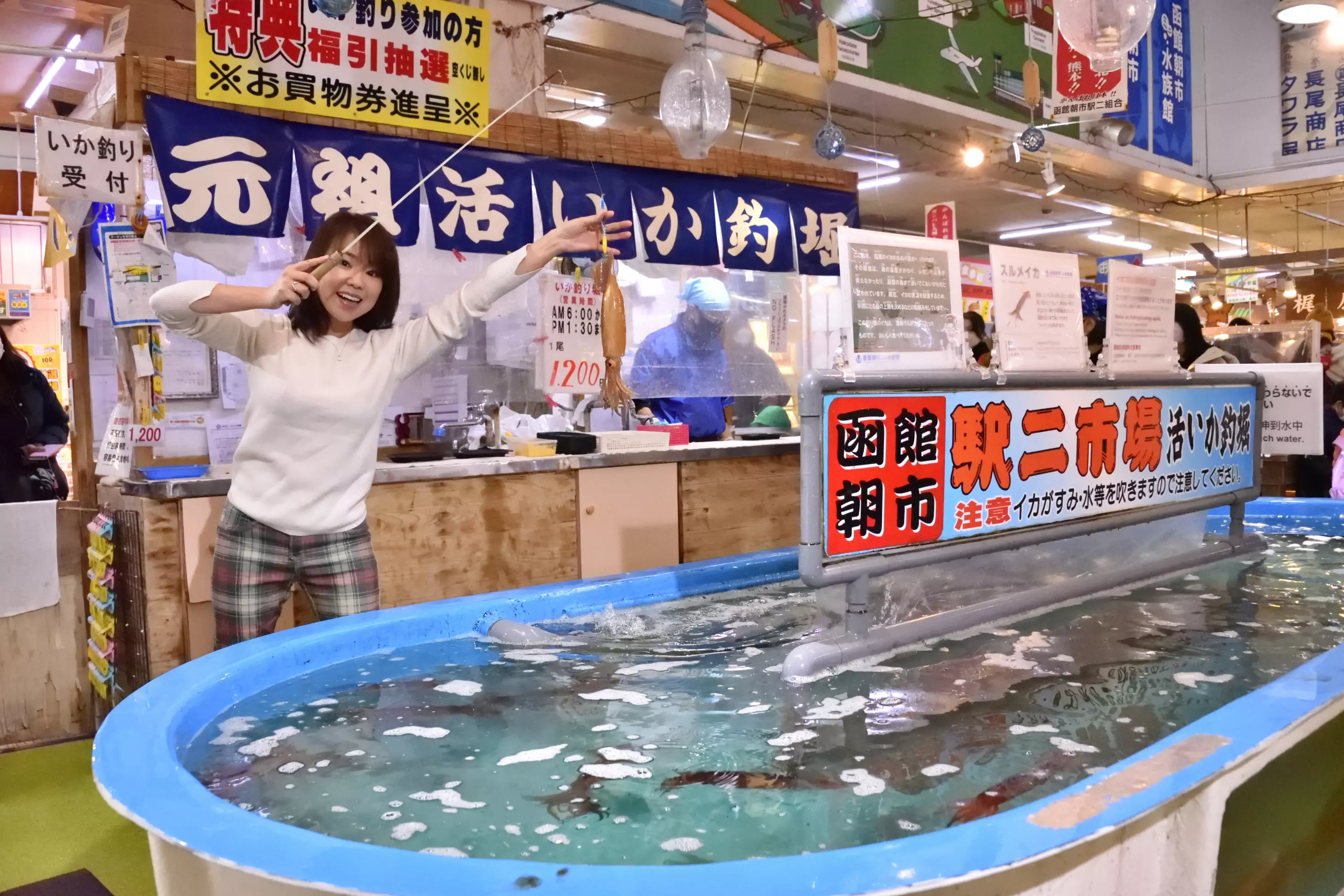 函館朝市の人気アトラクション、「活いか釣堀」でのいか釣り体験。水槽で泳ぐいかを釣り針に引っかけて釣り上げ、すぐに職人さんにさばいてもらって、ピチピチが食べられることで大人気です。料金はその日の漁の具合で変わりますが、調理代込みで1ぱい600円くらいから。⇒活いか釣堀(函館朝市イカ釣り体験)