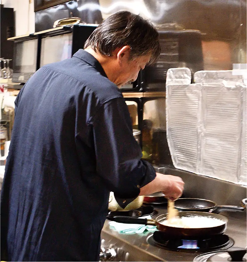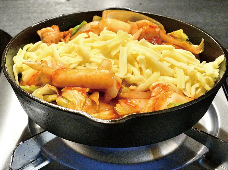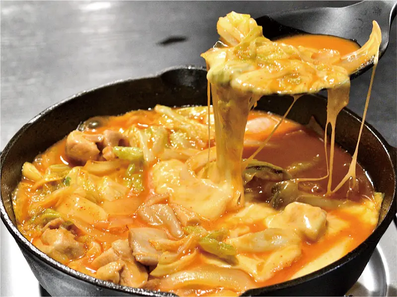 「チーズタッカルビ」は7年ほど前、東京を中心にブームが起きたのをきっかけに提供を始め、予約制で定番メニューに。プリプリの鶏モモ肉をはじめ、キャベツとタマネギ、モチモチの韓国餅〝トック〟を具材に、コチュジャンベースの甘辛いソースで炒めて、スキレットに盛り付けたらどっさりとシュレットチーズをトッピング。卓上コンロで煮立ったら食べ頃で、豪快にかき混ぜると、取り皿に移すのも大変なほどチーズがよく伸びる。じんわり汗をかくキリッとした辛さも、食べ進むほど野菜から染み出す甘みやチーズのまろやかさでクセになり、体の芯まで温まった頃には味のとりこになっている。
