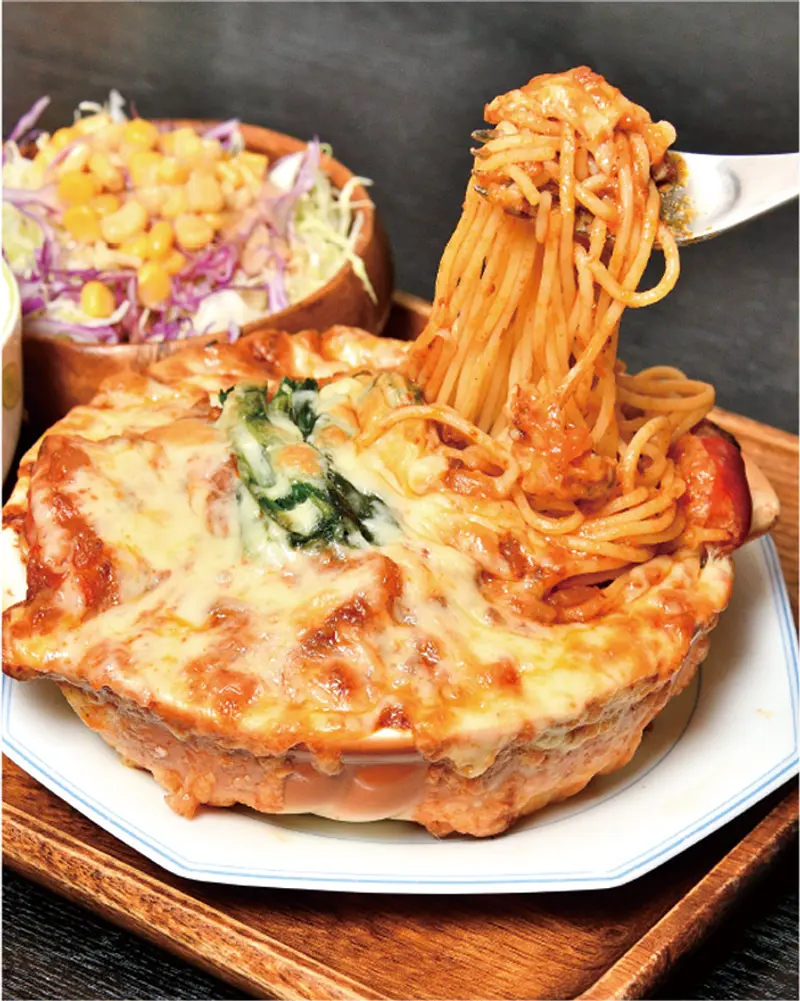 「ミートソースチーズ焼」は、皿からあふれ出したチーズが食欲を刺激する、幅広い世代に人気の一皿。70~90年代の函館の若者らに絶大な人気を誇ったトップスで「スパゲティグラティーナ」と呼ばれ、当時を懐かしんで足を運ぶ来店客の青春時代の思い出でもある。オーブンでこんがりと焼かれたトロトロのチーズにフォークを差し込めば姿を現すのは、ボリューム満点のスパゲッティ。ミートソースの優しい酸味を、モッツァレラなどのまろやかなミックスチーズが引き立て、歯ざわりの良いホウレンソウ、切れ目を入れた真っ赤なウインナーが程よいアクセントに。皿の縁に付いたカリカリに焼けたチーズをフォークで削りながら食べるのも楽しい。
