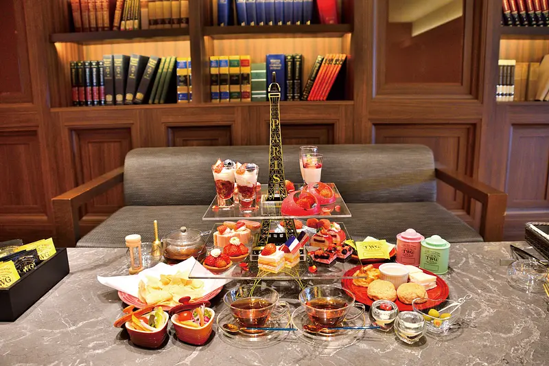 5月31日までは「ピンク&ストロベリー アフタヌーンティ パリジャンスタイル」と銘打ち、生のフルーツから、タルト、ショートケーキ、パフェやパンナコッタといったグラスデザートまで国産イチゴが主役。赤い花びらをあしらった、洗練された盛り付けに心も華やぐ。セイボリー(軽食)には野菜のキッシュ、ハムとポテトサラダのサンドイッチほか、リクエストの多かったミニサラダをプラス。アイスクリームの「ハーゲンダッツ」3種類も食べ放題で、フリーフロー(お代わり自由)の紅茶には、シンガポール発の高級紅茶ブランド「TWG Tea」が6種類揃う。お代わりに種類の制限は無く、時間はたっぷり最大180分を設定。ブラウンを基調に重厚感あふれる調度品に囲まれた空間で、非日常感に浸りたい。