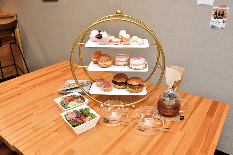 2023年にスタートしたアフタヌーンティーセットは、旬の果実やイベントごとに内容を変え、このセットでしか味わえないスイーツ、フード、ハイブランド紅茶を揃えた、リピーター続出のメニュー。5月いっぱいまで楽しめる「桜のアフタヌーンティー」は、サラクの塩漬けやリキュール、パウダーを使った優しい甘さのスイーツを用意した。ほのかな塩味がアクセントの杏仁豆腐ミニパフェ、シュワッと口の中で溶けるマカロン、パウンドケーキ、トリュフチョコレート、口当たり軽やかなハワイアンドーナツの生クリーム入りマラサダとサクラの香りが鼻腔をくすぐる多彩なスイーツほか、ミニセンイルケーキが1、2段目を飾る。フードは全粒粉のバンズから手作りするハンバーガー、生ハムとクリームチーズのバゲット、しっかりとした量のサラダが付いてボリューム満点。ゆっくり味わい過ごす時間に癒やされる。