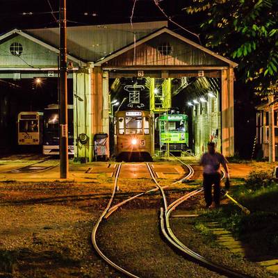 一日の仕事を終え、電車が一台また一台、車庫へ戻って来る頃合い