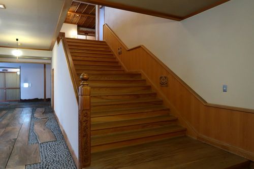 玄関を入ると正面に、創業当時のままの欅板の階段。床の玉石に年代物の杉材が埋め込まれ、精巧な彫刻と合わせて、ため息の出る美しさです。