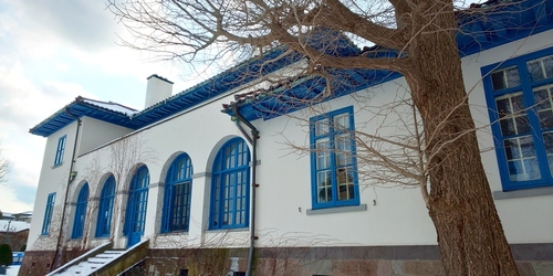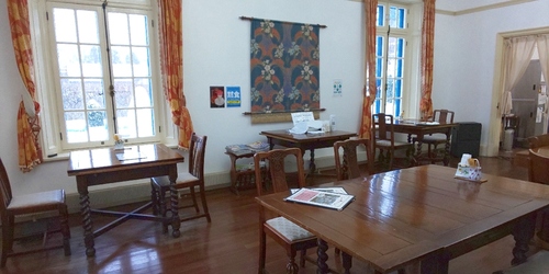 基坂ぞいに建つ旧イギリス領事館は、大正2年の建築。白い壁と青い窓枠が印象的です。その館内に、本場イギリスの紅茶が楽しめるティールームがあります。