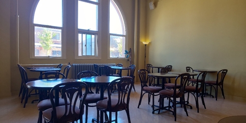 扉を開けるとミルクホールのような開放的な空間が目に飛び込みます。天井が高くて広々とし、カップルも、グループも、おひとり様も、それぞれの時間をゆったりと過ごしています。