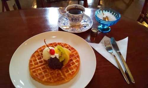 和洋モダンな甘みがいろいろ。フルーツワッフルは、サクサクのワッフルと色とりどりのフルーツに、 ちょこんとのったあんこがアクセント。