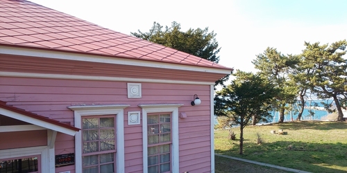 空と海に近く感じるピンクの建物は、明治18年に函館検疫所として建てられた歴史的建造物。このたたずまいだけで、なんだかほっとして心が温かくなる癒しの日本茶カフェです。