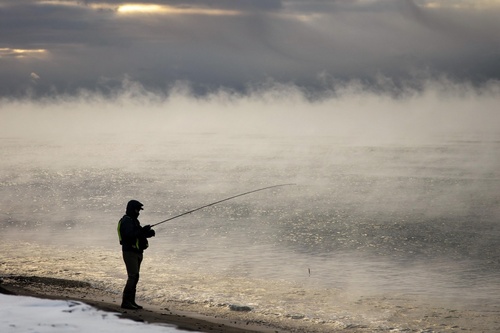 ときに波打ち際に立つ釣り人の姿も。目の前の海は、まるで「海の露天風呂」と錯覚させるような迫力があります。発生しやすい気温はマイナス15℃前後とのこと、お出かけの際は万全の防寒対策をしてどうぞ。