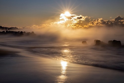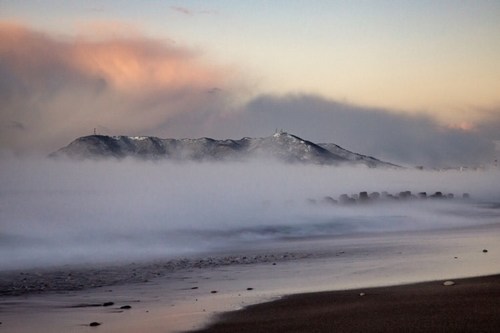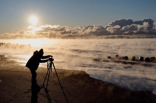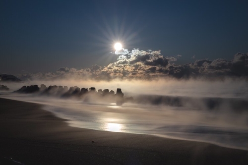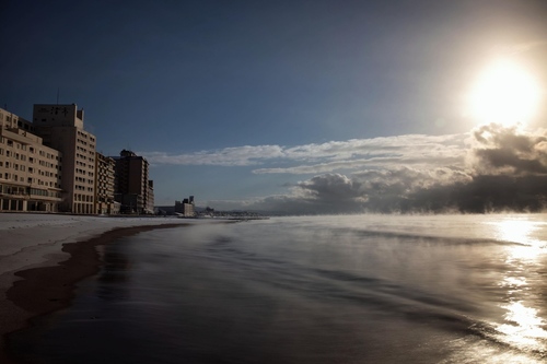 厳寒の冬の絶景、大森浜に立ち込める「毛嵐」