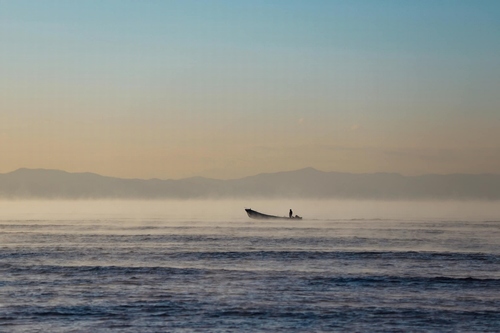 毛嵐の中を航行する漁船。「嵐」という言葉とは裏腹に、風の穏やかな晴れた日にみられるので、漁業関係者には喜ばれることが多いのですが、霧が立ちすぎると視界がわるくなることもあるそう。