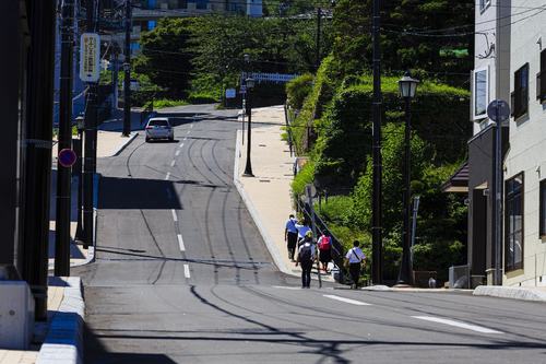 坂下には市電の「末広町」電停があり、朝夕は通学の函館西高等学校の生徒が上り下りします。隣は観光客で賑わう八幡坂ですが、こちらは高校生たちの普段使いの坂です。日中は函館山を背景にして、坂道の照り返しがじつに映えます。