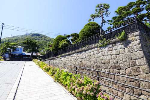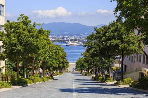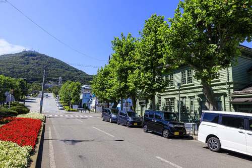 観光スポットからは少し外れて、あまり知られていない坂ですが、閑静な住宅街に和洋折衷スタイルの民家が点在し、落ち着いた雰囲気が魅力。秋には街路樹のナナカマドが色づく様子が見事。人気の大三坂にはない眼下の港の風景で、さわやかな秋が感じられます。