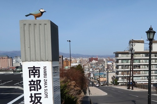 案内柱の上部にも注目! 函館市の鳥「ヤマガラ」のオブジェがちょこんと留まっています。