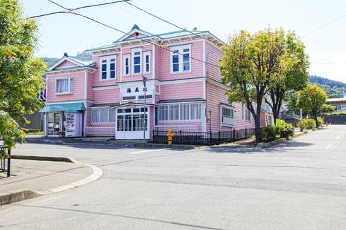 船見坂の上方にある大正建築、大正湯。映画「パコダテ人」の舞台にもなり、ピンクの板壁のレトロな外観が印象的です。