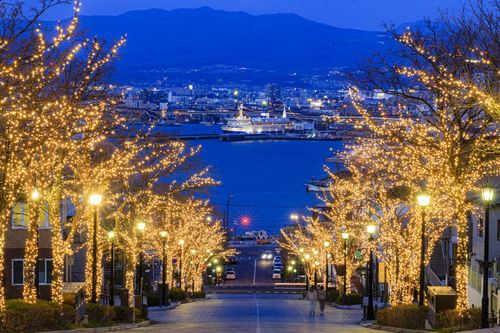 度重なる大火への対策で、幅員が二十間(約36メートル)と非常に広くとられ、石畳が印象的な坂道。大きな広場を思わせる雰囲気も持ち合わせています。突き当たり近くには真宗大谷派 函館別院。沿道にはケヤキの街路樹が並び、夏には心地よい緑陰をつくり、冬にはイルミネーションが灯ります。