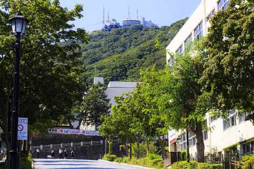 ロープウェイ山麓駅へと導く南部坂。坂の下方はバス路線にもなっていて緩やかですが、山麓駅が近づくにつれて、急激に勾配がきつくなります。本当に歩いて上れるのか?と思うほどで、壁のようにも見える坂の風景がみどころです。