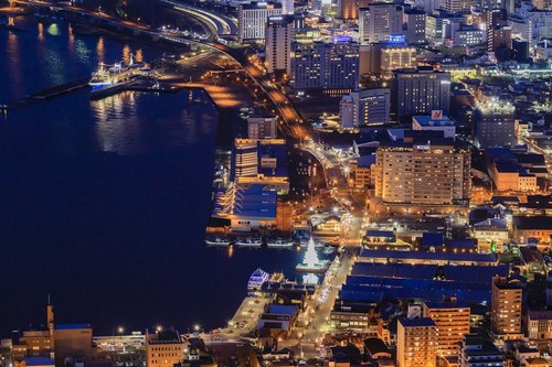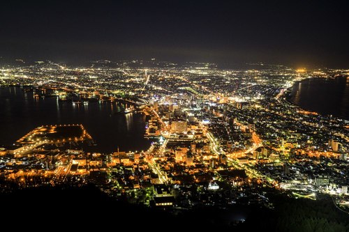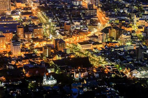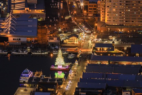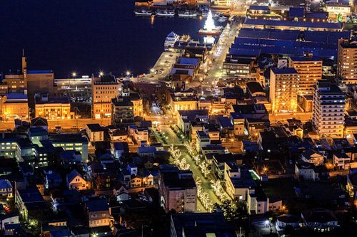 よく「宝石箱みたい」と称される函館山からの夜景。その光の中に、この季節ならではの輝きを探してみましょう。ベイエリアから函館山に向かって伸びる八幡坂は、函館でもっとも人気のある坂のひとつ。その街路樹に、ひときわまぶしいイルミネーションが施されているのがわかりますか(写真をクリック・ピンチすると拡大されます)。