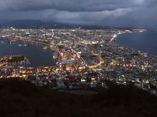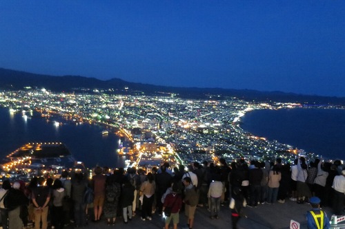 世界三大夜景の一つ、函館山から望む函館市内。夕方の通り雨で空気は澄み、街はいつもよりいっそう輝いて見えました。現在、函館山ロープウェイは整備期間のため終日運休中。山麓駅近くの駐車場から臨時のシャトルバスが運行しています。
