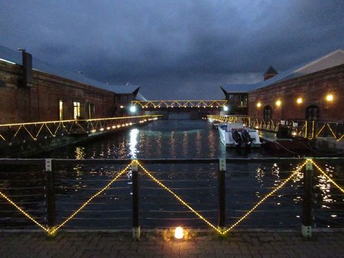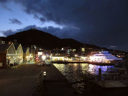夕方5時過ぎ、通り雨のベイエリア。夕暮れ時から夜にかけて、赤レンガ倉庫群や観光遊覧船、掘割の周辺がライトアップされ、しっとりロマンチックな雰囲気に包まれます。
