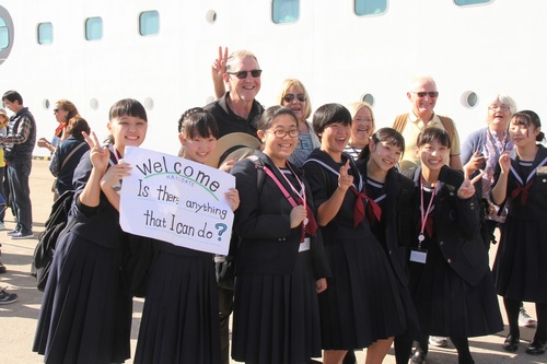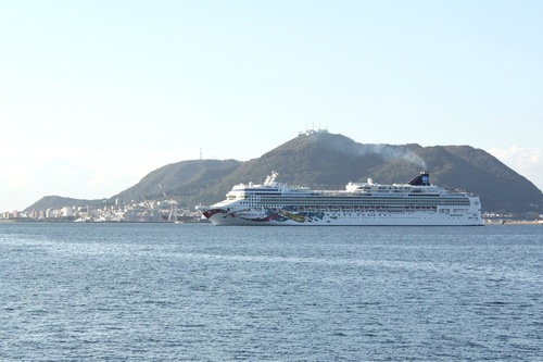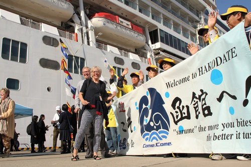 青空の朝、函館港にクルーズ客船ノルウェージャン ジュエル(93,502トン)が、約2000人の乗客を乗せて入港。岸壁では通訳ボランティアの遺愛女子高校の生徒さんや市民団体「カムカムの会」の皆さんが出迎えました。