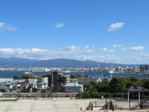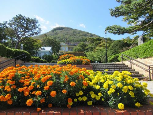 基坂の突き当たり、函館港や市街地を見渡せる元町公園は、秋風が心地よく、いつまでも景色を眺めていたくなる場所。後ろには函館山の山頂が見え、木々が色づき始めているのがわかります。