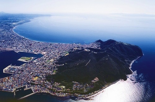 (空から見た函館山。函館山は昔、島だったことが想像できる *2)