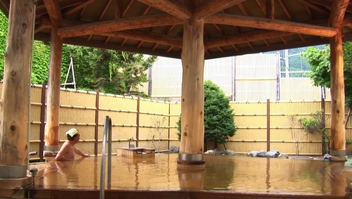 温泉は源泉掛け流し、鉄分を含んだ茶褐色のお湯で、どっぷりつかると胸から下は見えなくなってしまうくらい。お湯をすくって白いタオルを浸すと茶色く染まり、びっくりするかもしれません。浴槽は高温(約43.5℃)、中温(約41℃)、気泡風呂(約40℃)と分かれているので、お湯の好みや気分に合わせて入れます。