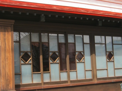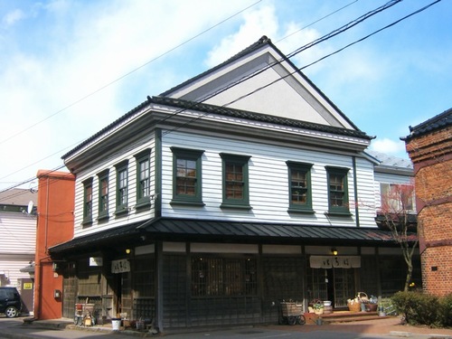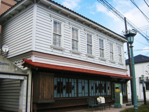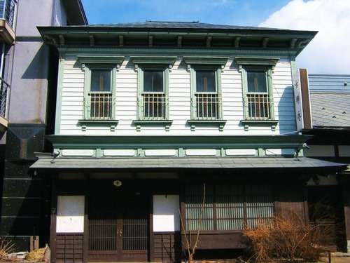 明治末期に建てられ、現在は喫茶店として利用されています。均等に置かれた上げ下げ式の窓とその周辺の装飾、イギリス式の下見板張り、西洋の古典建築に見られるアカンサス風の凝った装飾が施された軒下の持送り。1階の連なった窓にはステンドグラスがはめ込まれ、和風の中にも洋風を感じさせるなど、ほかにはないモダンな特色を持っています。