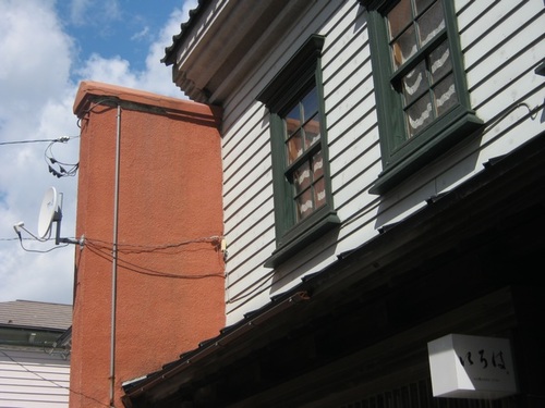 和洋折衷は表の1面だけという住宅が多い中、4面ともある数少ない建物。雑貨店として利用されていて、際立った存在感があります。1階はささら子下見張り、開口部に格子戸、2階は下見板で縦長の上げ下げ窓。軒まわりに豪華な装飾をあえて施さず、三角形の破風に漆喰が塗られている質素さが特徴です。防火対策を考えて、建物左手に付けられた煉瓦製の防火壁「うだつ」も見事なものとなっています。