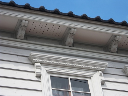 屋根を支える「持送り」と、その下の「軒蛇腹」の装飾帯(旧茶屋亭)