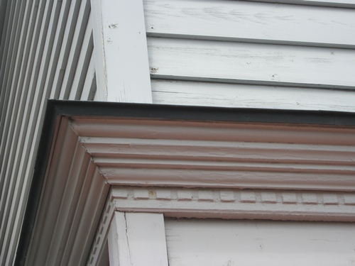 1階と2階の境の「胴蛇腹」。壁面は下見板張り(旧茶屋亭)