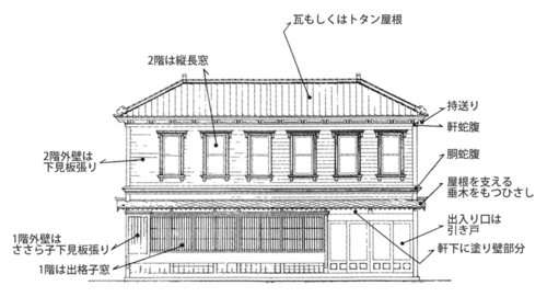 ところが、開港したとはいえ函館の輸出入額はわずかなもので、外国商人はより大きなマーケットを求めて横浜や神戸を目指し、函館を去り始めます。せっかく苦労して洋風建築技術を習得した函館の大工たちには、洋館を建てる機会が減少する一大事。そこで、当時財力があった海産商を中心に、店舗・住宅の建築に洋風の様式を取り入れることを強力に勧誘します。当時の函館商人は、諸外国と不利な商取引を強いられていました。長年の悲願である対等の取引を行うためにも、馴染んだ和風の生活様式を守りつつ、洋風を意識した店舗・住宅で対等な立場を強烈に誇示する必要があると考えられたのでしょう。