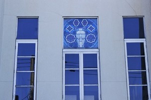 鉄筋コンクリート造りの建物で、両わきの渦巻き模様や玄関上の照明など、とてもモダンなデザインです。