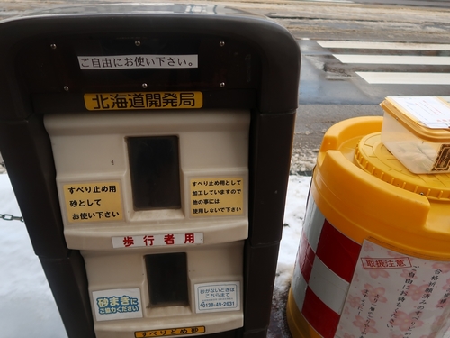道路わきには「砂箱」があり、中に「すべりどめ用砂」が入っています。だれでも自由に使えるので、後から来る人のためにも、滑りやすい道には砂をまくといいでしょう(どちらかというと市民の役目ですが、経験としては面白いと思います)。