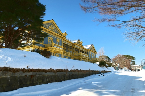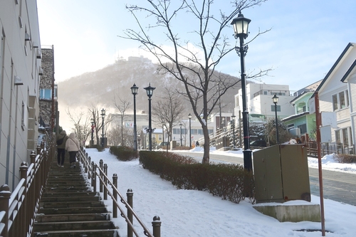 八幡坂は、歩道の階段にロードヒーティングがされているので、雪がありません。坂の上り下りは八幡坂を使い、上りきってから横に移動するのがおすすめです。突き当りを左に向かうと教会群、右に向かうと旧函館区公会堂があります。