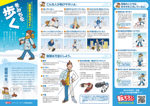 ウインターライフ推進協議会発行のリーフレット「函館冬みちガイド~」は、冬の函館を楽しく観光するための役立ち情報が満載。こんな人は転びやすい、服装は万全に、雪国の人の歩き方、すべりやすい場所などを事前に頭に入れておくと、安心です。