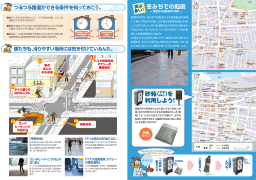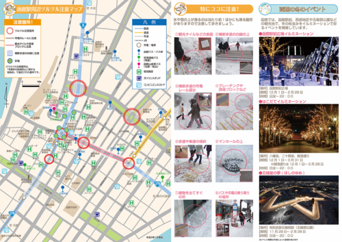 函館駅周辺で、具体的に滑りやすいポイントや、上手な歩き方、緊急連絡先などをまとめたリーフレットをインターネットで見られます。