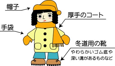 暖かい服装をすることは防寒の意味合いだけではありません。転びにくくすることや、転んだ時の衝撃を吸収する役割もあるのです。紙袋などで両手がふさがってしまうと歩く時のバランスが悪くなり、転んだ時の受け身も取れませんから、荷物はリュックやショルダーバッグなどに入れて両手をあけるようにしたいものです。