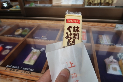 そのほか、社務所で「函館八幡宮特製 味噌くるみ餅」も販売されています。函館みやげでも人気の銘菓「きびだんご」の天狗堂宝船社製造。お守りと同じ袋に入れてもらえます。味噌とくるみの香ばしさで、くせになる美味しさ。1本130円。