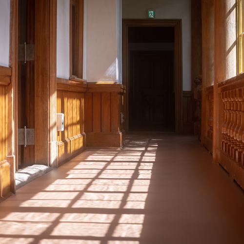 大人気のフォトスポット、ホールの外側の廊下(縁側)。ゆがみガラスの窓から注ぎ込む日差しが床に映る様子を。