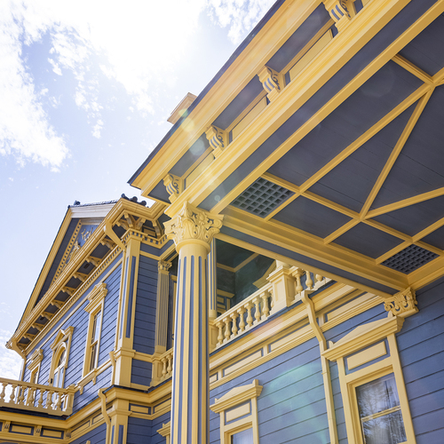 定番ではありますが、鮮やかな青灰色と黄色のコントラストが素敵。濃いブルーの門扉をアクセントに。