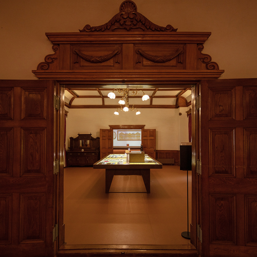 休憩所の大食堂より。3つの部屋の扉から扉へと続いた先に見えるシアタールームのスクリーンを狙って。