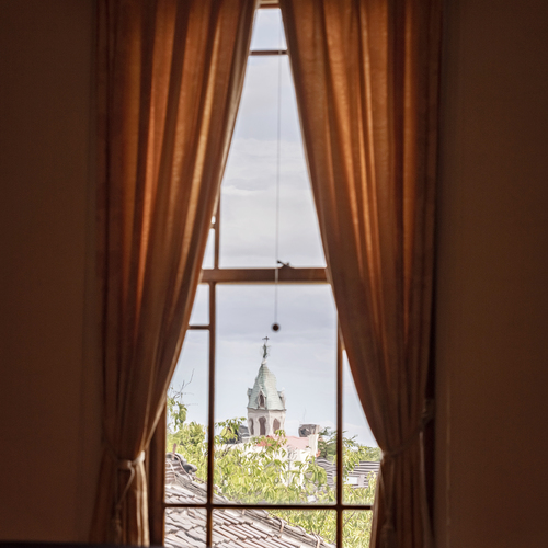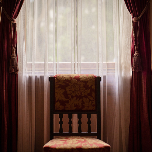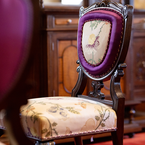 シアターになっている予備室の、明治時代からあるアンティークな椅子。窓から優しく注ぎ込む光とともに。