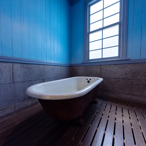 見逃してしまいそうな、1階奥の洋風浴室。ブルーの壁とレトロなバスタブのコントラストは、ぜひローアングルから。