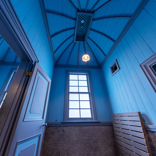 目の覚めるようなブルーの壁と天井、細部にわたる造りの美しさに注目。