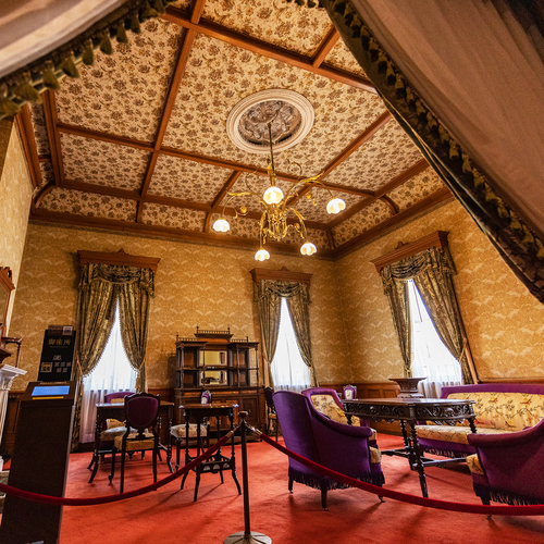 建築当初からの壁紙や天井、カーテン、家具を生かして補修され、アンティークな空間に。