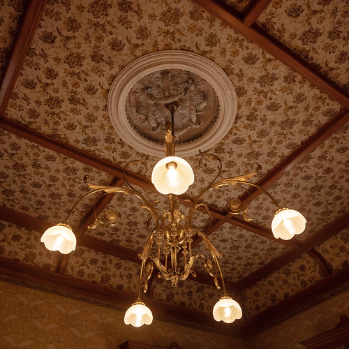 天井飾りの漆喰のレリーフも、建築当初のもの。クラシックな壁紙とシャンデリアの組み合わせがエレガントです。